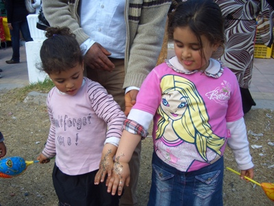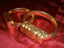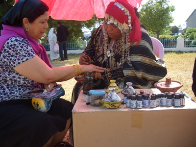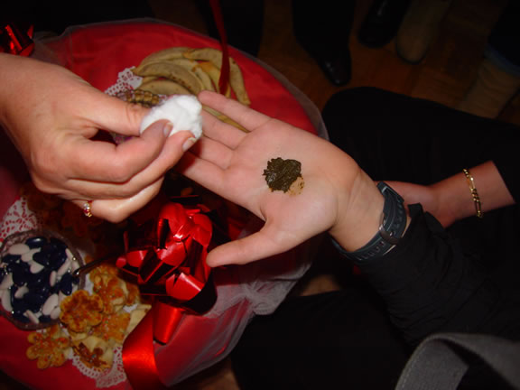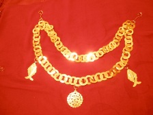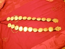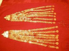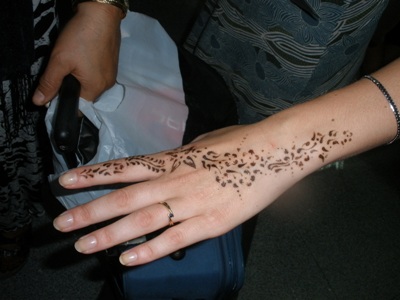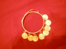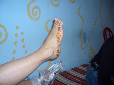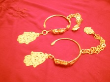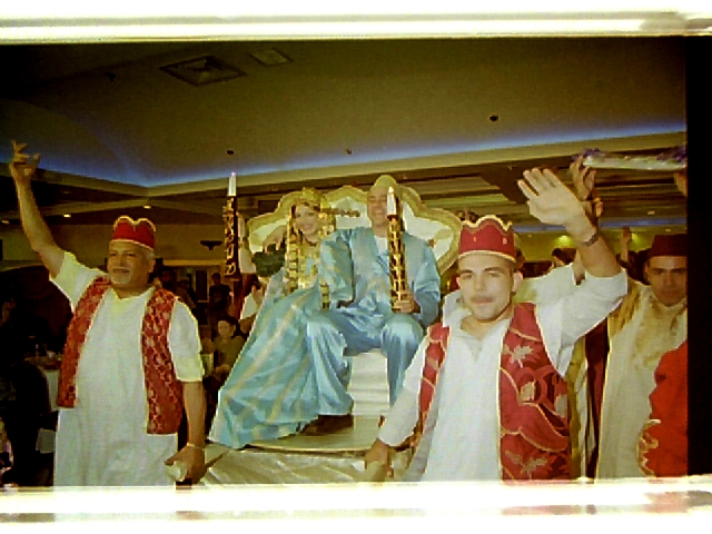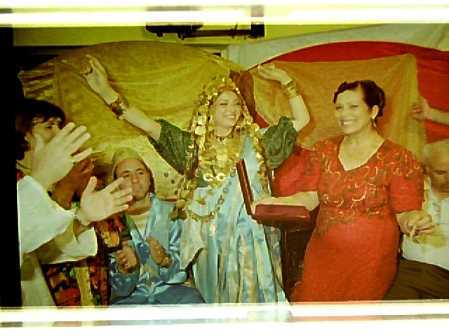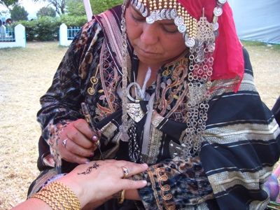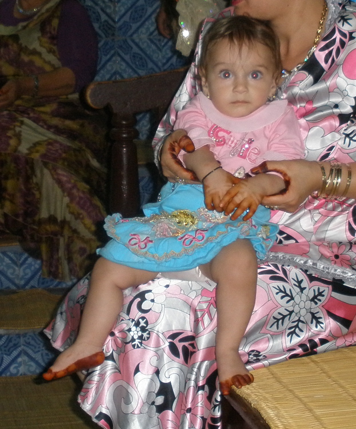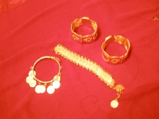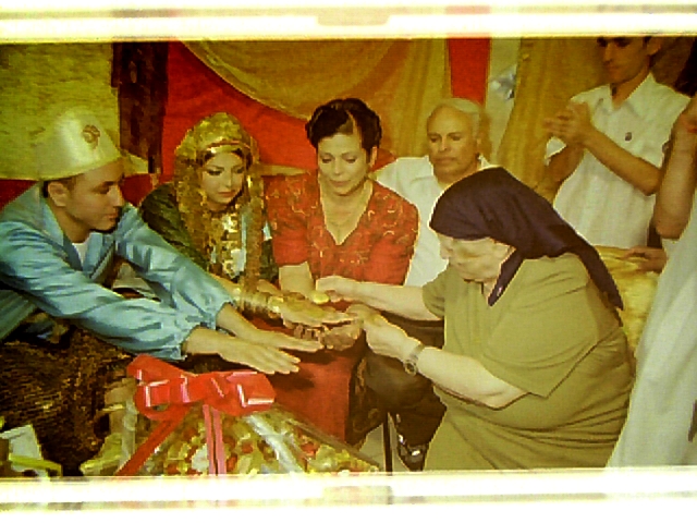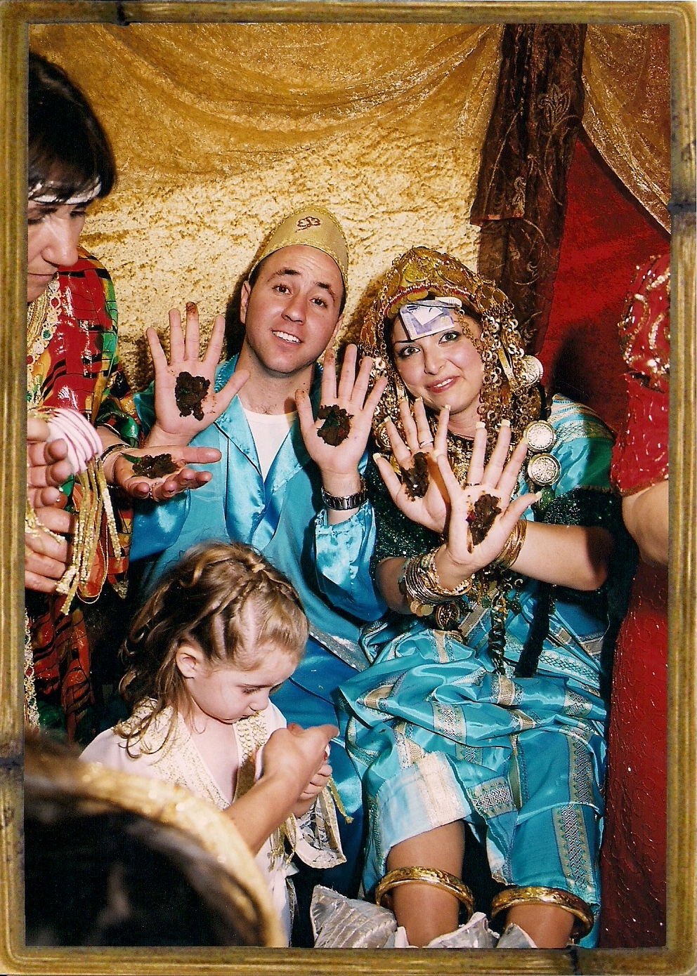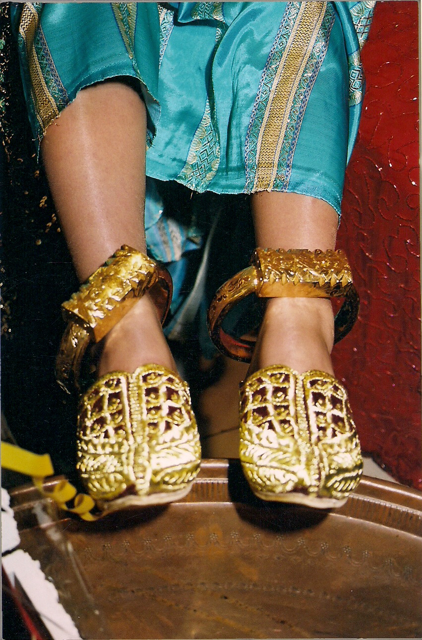 : התמונות למעלה מימין: הסבתא מברכת החתן והכלה ומפזרת על ידיהם מטבעות ויחד עם כל מטבע מברכת ברכה באמצע: אם הכלה מעניקה מתנה לבתה הכלה תכשיטי זהב משמאל: החתן והכלה מובלים על ידי אורחים ונרות מקושטים לתחילת טכס החינה התמונות התחתונות מימין: אם הכלה ובידה מגש החינה מוצג לראווה עם סוכריות דרג'ה וממתקים משמאל: הכלה הנרגשת מציגה את רגלה הנושאת כלכאל - צמיד הרגל לעיני כל קולולולולולולולו | ![]() |